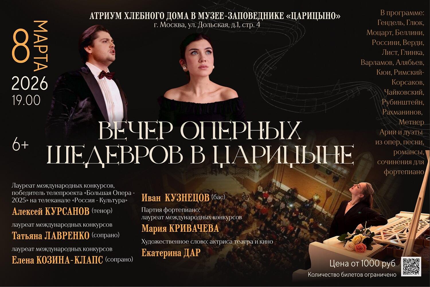 8 марта 2026 года в аристократичной атмосфере музея-заповедника «Царицыно» пройдет грандиозный концерт, посвященный шедеврам классической музыки и мировой оперы. В исполнении блестящих солистов, лауреатов международных конкурсов, прозвучат арии из опер Г. Ф. Генделя, К. В. Глюка, В. А. Моцарта, Дж. Россини, Дж. Верди, М. И. Глинки, П. И. Чайковского, С. В. Рахманинова, А. Алябьева, А. Варламова, Ц. Кюи, А. Рубинштейна.