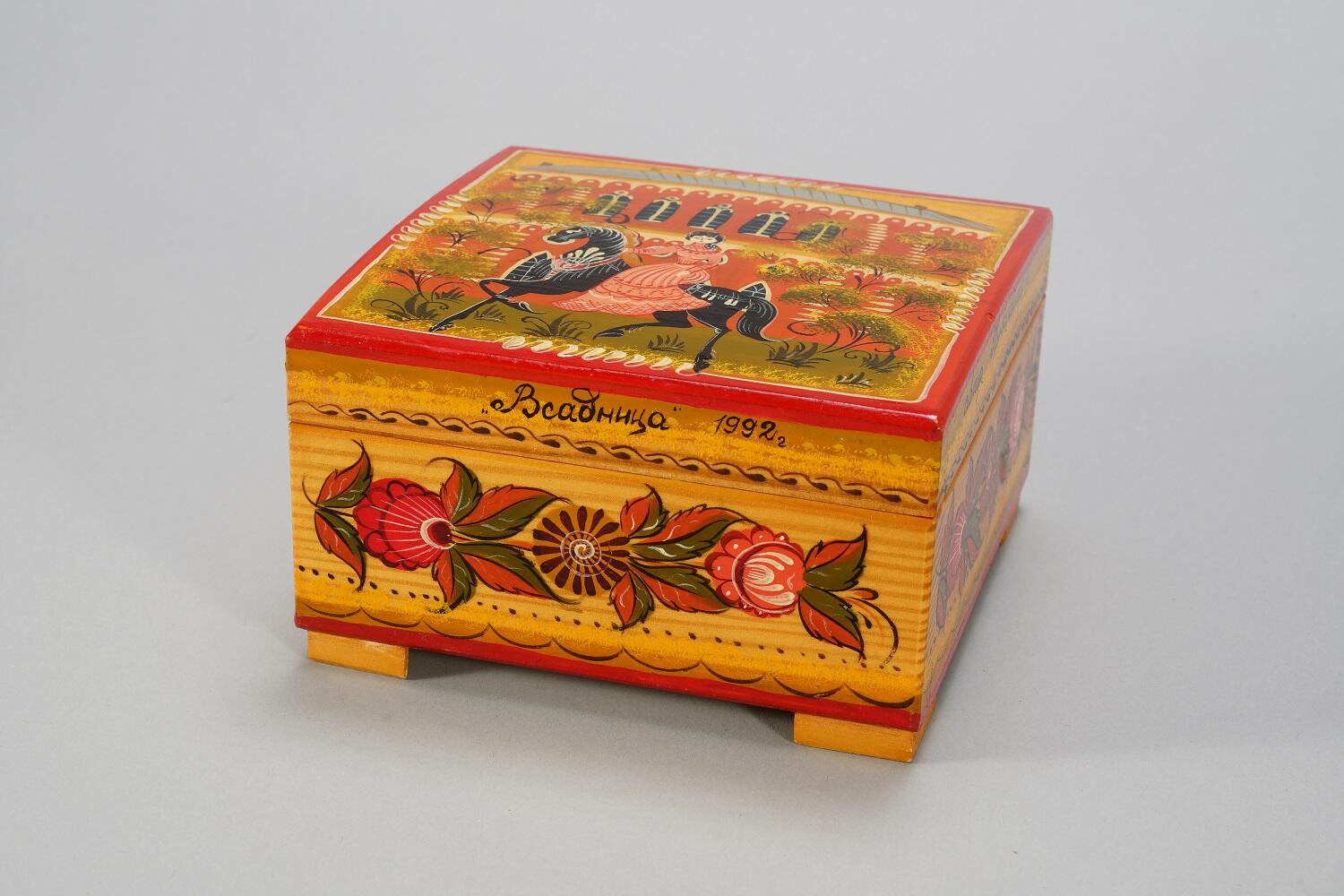 После образования Государственного музея декоративно-прикладного искусства народов СССР (название, которое наш музей носил в 1984–1991 годах) произведения на царицынскую тему появляются и по его инициативе. В 1989‒1990 годах для придуманного научным сотрудником музея Юрием Васильевичем Максимовым (1932–2012) конкурса «Царицыно — выдающийся ансамбль конца XVIII века» (к 250-летию со дня рождения архитекторов Василия Ивановича Баженова и Матвея Фёдоровича Казакова) серию работ о Царицыне выполнили мастера городецкой росписи. Традиционные для промысла сюжеты: чаепития, катания на тройках, праздничные народные гулянья — развернулись на фоне царицынской архитектуры и природы. Каждая мастерица выбрала близкую ей цветовую гамму, предложила свою вариацию традиционных композиций, украсивших панно, тарелки, ларцы. Лучшие работы стали частью музейной коллекции.