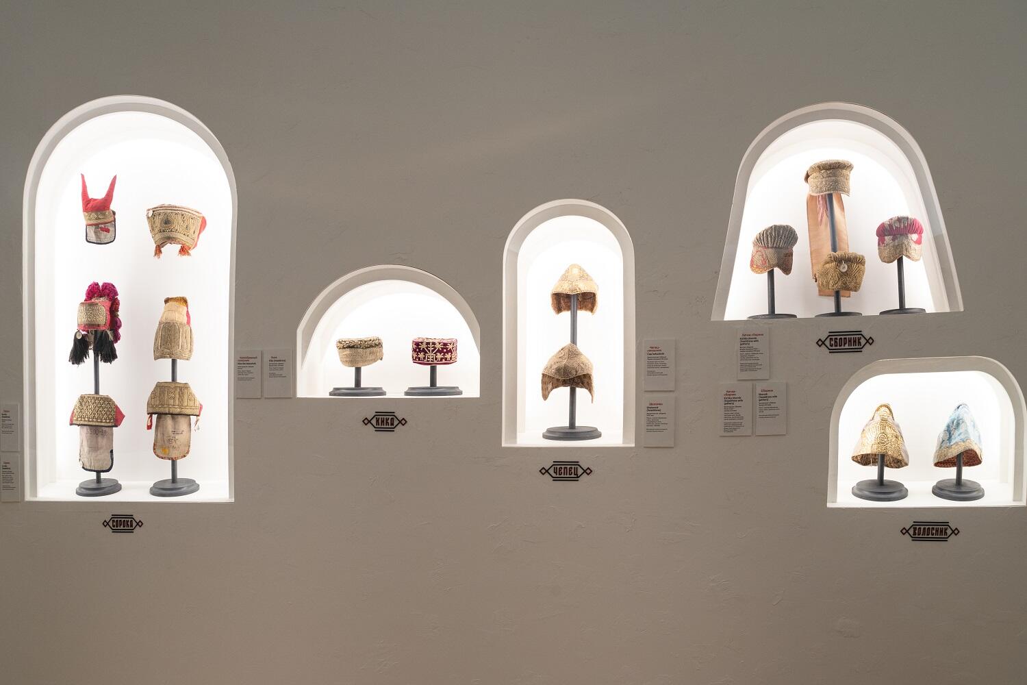 Экспозиция занимает десять залов Хлебного дома, и в каждом раскрывается одна из тем, поднятых кураторами, от разнообразия головных уборов и украшений до богатства материалов и приемов народного рукоделия, от роли предметов в обрядах свадьбы и крещения до красоты праздничного костюма разных регионов России. В зале «Красота по-русски» благодаря поддержке портала «Культура.РФ» можно послушать записи фольклорного ансамбля «Толока», участники которого уже много лет изучают нематериальное наследие и русские музыкальные традиции в экспедициях по деревням. Атмосферу отечественной культуры XIX столетия с её ревностным поиском национальных корней можно почувствовать в зале «Поэтика народного костюма: живопись и театр», где представлены полотна русских художников, театральные эскизы и костюмы. В зале «Поехали на ярмарку!» гости смогут вообразить себя живущим в XIX веке любителем русской старины, путешествующего по разным городам в поисках старинных головных уборов.
